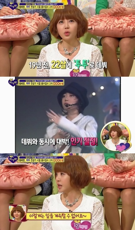 황혜영은 지난 7일 방송된 SBS ‘스타 부부쇼 자기야’(이하 ‘자기야’)에서 “19년전 22세의 나이에 투투로 데뷔했다”고 말문을 열었다.
