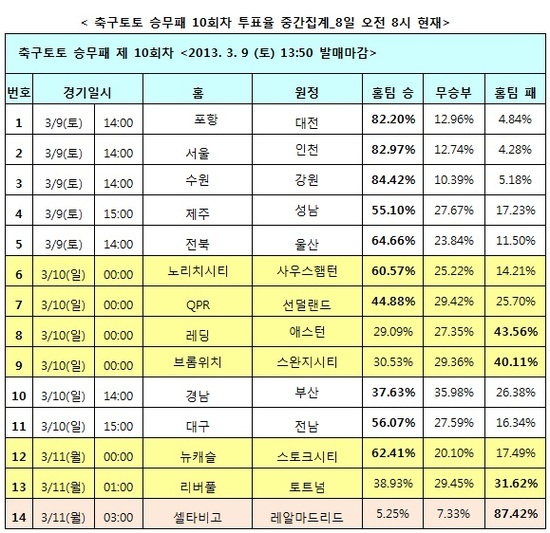 [축구토토] 국민체육진흥공단(www.kspo.or.kr)이 발행하는 체육진흥투표권 수탁사업자인 스포츠토토 온라인 공식 발매사이트 베트맨(www.betman.co.kr)은 오는 9일부터 11일에 열리는 국내 프로축구 K리그 클래식 7경기와 잉글랜드 프리미어리그(EPL) 6경기, 스페인 프리메라리가 1경기 등 총 14경기를 대상으로 한 축구토토 승무패 10회차 투표율 중간집계 결과, 전북-울산(5경기)전에서 국내 축구팬 64.66%는 전북이 울산에 승리를 거둘 것으로 예상했다고 밝혔다.