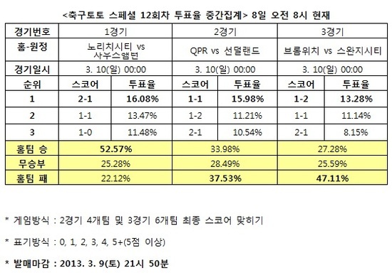 [축구토토] 국민체육진흥공단(www.kspo.or.kr)이 발행하는 체육진흥투표권 수탁사업자인 스포츠토토 공식 온라인 발매 사이트인 베트맨(www.betman.co.kr)은 오는 10일에 펼쳐지는 노리치시티-사우스햄턴(1경기), QPR-선덜랜드(2경기), 브롬위치-스완지시티(3경기)전 등 잉글랜드 프리미어리그 3경기를 대상으로 한 축구토토 스페셜 12회차 투표율 중간집계 결과, 축구팬 47.11%는 3경기 브롬위치-스완지시티전에서 스완지시티의 승리를 예상했다고 밝혔다.