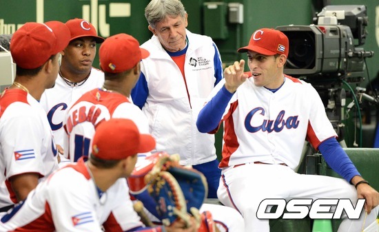 8일 오후 일본 도쿄돔에서 2013 월드베이스볼클래식(WBC) 2라운드 1조 네덜란드와 쿠바의 경기, 경기에 앞서 쿠바 선수들이 덕아웃에서 이야기를 나누고 있다.