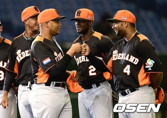 8일 오후 일본 도쿄돔에서 2013 월드베이스볼클래식(WBC) 2라운드 1조 네덜란드와 쿠바의 경기, 경기에 앞서 열린 식전행사에서 네덜란드 앤드루 존스와 블라디미르 발렌틴이 하이파이브를 하고 있다.
