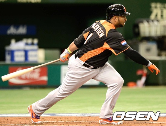 8일 오후 일본 도쿄돔에서 2013 월드베이스볼클래식(WBC) 2라운드 1조 네덜란드와 쿠바의 경기, 1회초 2사 1루 네덜란드 발렌틴이 중전 안타를 치고 있다.