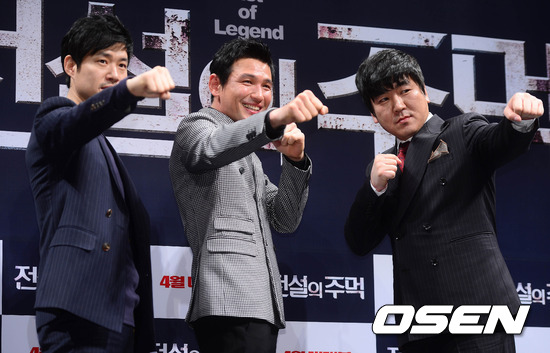 8일 오전 서울 신사동 CGV 압구정에서 열린 영화 '전설의 주먹' 제작보고회에서 유준상 황정민 윤제문이 포토타임을 갖고 있다.