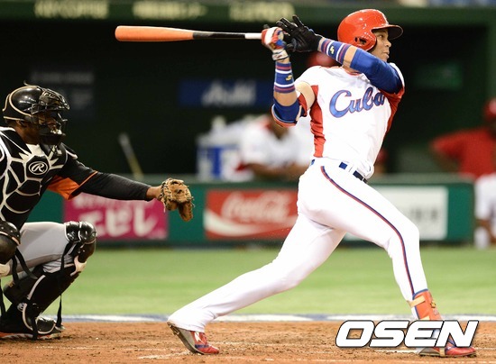 8일 오후 일본 도쿄돔에서 2013 월드베이스볼클래식(WBC) 2라운드 1조 네덜란드와 쿠바의 경기, 1회말 2사 쿠바 페르난데스가 중전안타를 치고 있다.