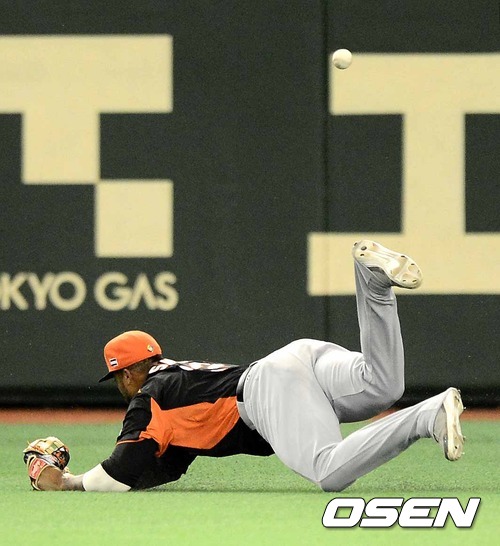 8일 오후 일본 도쿄돔에서 2013 월드베이스볼클래식(WBC) 2라운드 1조 네덜란드와 쿠바의 경기, 1회말 2사 네덜란드 샘스가 쿠바 페르난데스의 타구를 놓치고 있다.