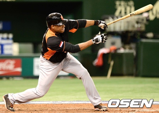8일 오후 일본 도쿄돔에서 2013 월드베이스볼클래식(WBC) 2라운드 1조 네덜란드와 쿠바의 경기, 2회초 무사 네덜란드 스타티아가 중월 솔로홈런을 치고 있다.