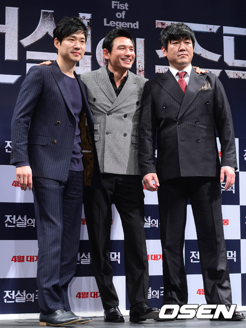8일 오전 서울 신사동 CGV 압구정에서 열린 영화 '전설의 주먹' 제작보고회에서 유준상 황정민 윤제문이 포토타임을 갖고 있다.
