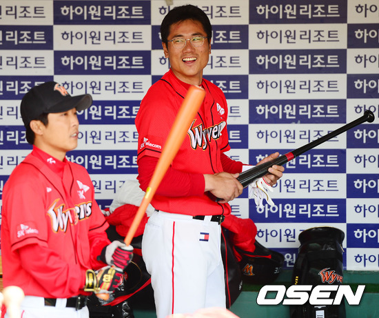경기 전 SK 박정권이 덕아웃에서 새 배트의 비닐을 뜯으며 미소짓고 있다.