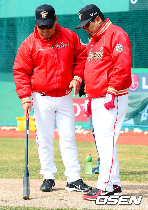 경기 전 SK 이만수 감독이 이광근 수석 코치와 얘기를 나누고 있다.