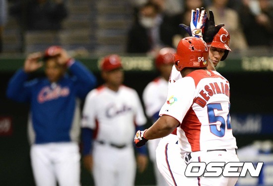 8일 오후 일본 도쿄돔에서 2013 월드베이스볼클래식(WBC) 2라운드 1조 네덜란드와 쿠바의 경기, 2회말 무사 쿠바 데스파이녜가 솔로홈런을 치고 홈에서 동료의 축하를 받고 있다.