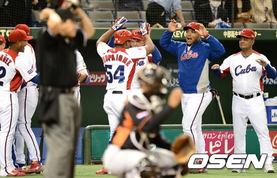 8일 오후 일본 도쿄돔에서 2013 월드베이스볼클래식(WBC) 2라운드 1조 네덜란드와 쿠바의 경기, 2회말 무사 쿠바 데스파이녜가 솔로홈런을 치고 홈에서 동료들의 축하를 받고 있다.