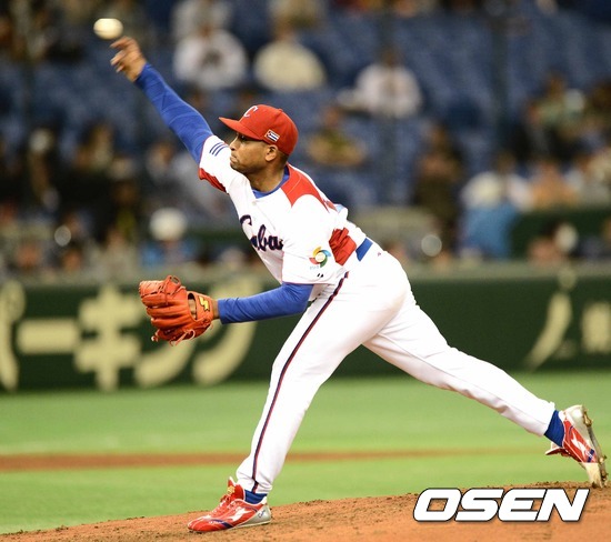 8일 오후 일본 도쿄돔에서 2013 월드베이스볼클래식(WBC) 2라운드 1조 네덜란드와 쿠바의 경기, 2회초 2사 2루 쿠바 선발투수 히메네스와 교체된 알바레스가 힘차게 공을 던지고 있다.