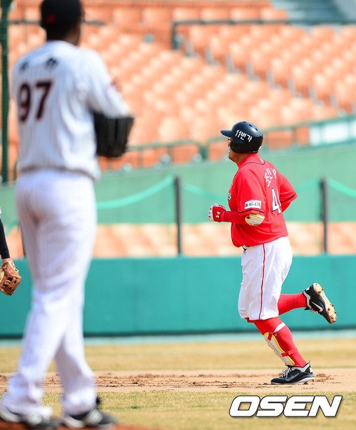 2회초 1사 주자 1루 SK 조인성이 유먼을 상대로 좌월 투런 홈런을 날린 후 그라운드를 돌고 있다.