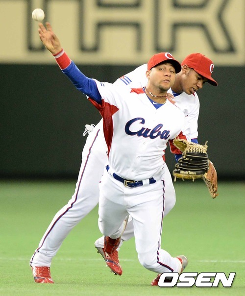 8일 오후 일본 도쿄돔에서 2013 월드베이스볼클래식(WBC) 2라운드 1조 네덜란드와 쿠바의 경기, 3회말 무사 쿠바 구리엘이 네덜란드 샘스의 땅볼 타구를 잡아 1루로 송구하던 중 아르에바르에나와 충돌하고 있다. 송구가 늦어 네덜란드 샘스는 안타를 기록했다.