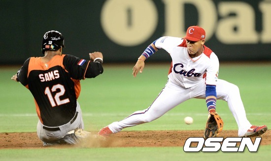 8일 오후 일본 도쿄돔에서 2013 월드베이스볼클래식(WBC) 2라운드 1조 네덜란드와 쿠바의 경기, 3회말 무사 1루 네덜란드 히카르도 타석때 1루주자 샘스가 도루에 성공하고 있다.