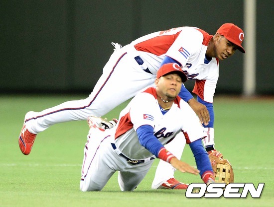 8일 오후 일본 도쿄돔에서 2013 월드베이스볼클래식(WBC) 2라운드 1조 네덜란드와 쿠바의 경기, 3회말 무사 쿠바 구리엘이 네덜란드 샘스의 땅볼 타구를 잡아 1루로 송구하던 중 아르에바르에나와 충돌하고 있다. 송구가 늦어 네덜란드 샘스는 안타를 기록했다.