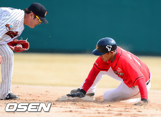 3회초 무사 주자 1,2루 SK 최윤석 타석에서 1루 주자 이명기가 2루 도루에 성공하고 있다.