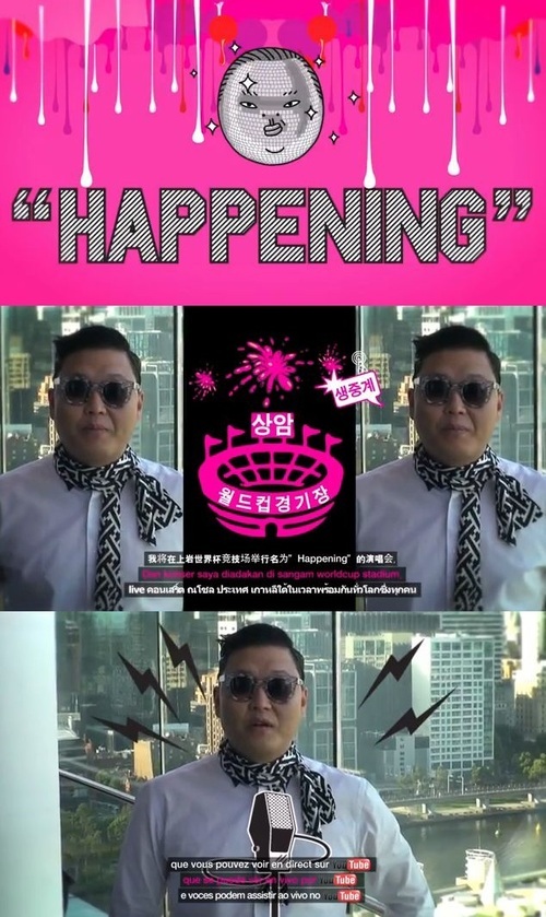 싸이는 8일 오후 유튜브 영상을 통해 “2013년 4월 13일 저의 새로운 싱글 전 세계 동시 발매. 이를 기념하기 위한 저의 콘서트 ‘해프닝’ 상암 월드컵 경기장에서! 그리고 유튜브를 통해 전 세계 생중계한다”라고 직접 발표했다.