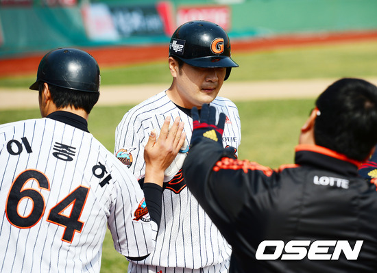 3회말 1사 주자 없는 상황에서 롯데 문규현이 솔로홈런을 날린 후 덕아웃에서 동료들과 기쁨을 나누고 있다.