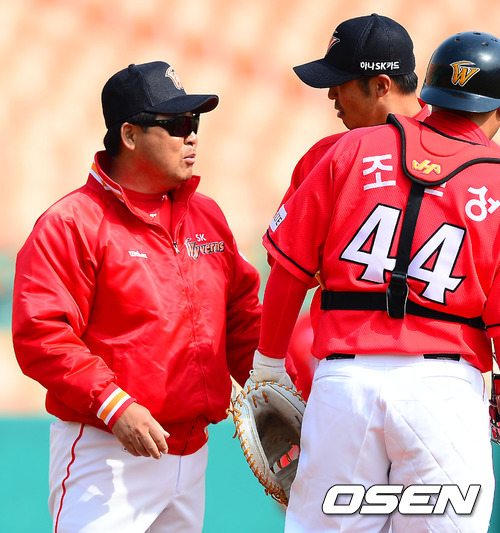 4회말 1사 주자 만루 SK 이만수 감독이 마운드에서 선발 세든 대신 교체투입한 임경완과 얘기를 나누고 있다.