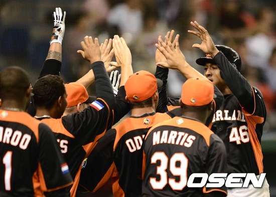 8일 오후 일본 도쿄돔에서 2013 월드베이스볼클래식(WBC) 2라운드 1조 네덜란드와 쿠바의 경기, 6회초 2사 1,3루 네덜란드 스홉이 스리런 홈런을 치고 덕아웃에서 동료들의 축하를 받고 있다.