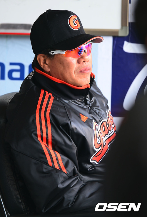 롯데 김시진 감독이 덕아웃에서 경기를 주시하고 있다.