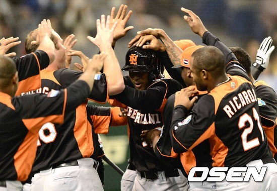 8일 오후 일본 도쿄돔에서 2013 월드베이스볼클래식(WBC) 2라운드 1조 네덜란드와 쿠바의 경기, 6회초 2사 1,3루 네덜란드 스홉이 스리런 홈런을 치고 덕아웃에서 동료들의 축하를 받고 있다.