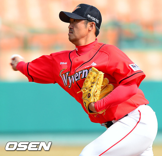 4회말 1사 주자 만루 SK 선발 세든 대신 마운드에 오른 임경완이 힘차게 공을 뿌리고 있다.