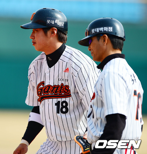 5회말 2사 주자 2,3루 롯데 김대우가 중전 2타점 적시타를 날린 후 1루에서 공필성 코치에게 축하를 받고 있다.