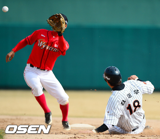 5회말 2사 주자 1루 롯데 박종윤 타석에서 1루 주자 김대우가 2루 도루를 시도하고 있다.