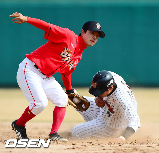 5회말 2사 주자 1루 롯데 박종윤 타석에서 1루 주자 김대우가 2루 도루를 시도했으나 SK 유격수 김성현에게 태그아웃을 당하고 있다.