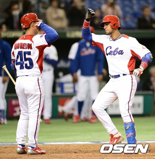 8일 오후 일본 도쿄돔에서 2013 월드베이스볼클래식(WBC) 2라운드 1조 네덜란드와 쿠바의 경기, 7회말 1사 쿠바 구리엘이 솔로홈런을 치고 모레혼과 하이파이브를 하고 있다.