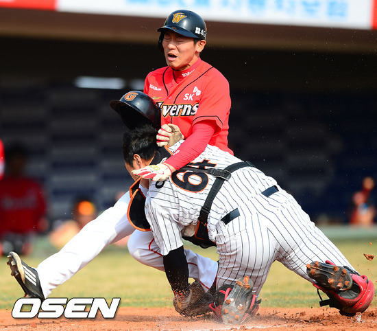 8회초 2사 주자 1,2루 SK 박승욱의 1타점 적시타때 2루 주자 김재현이 홈으로 몸을 날리며 롯데 이종하 포수와 충돌하고 있다.