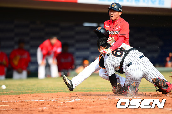 8회초 2사 주자 1,2루 SK 박승욱의 1타점 적시타때 2루 주자 김재현이 홈으로 몸을 날리며 롯데 이종하 포수와 충돌하고 있다.