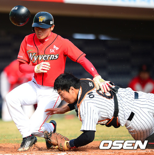 8회초 2사 주자 1,2루 SK 박승욱의 1타점 적시타때 2루 주자 김재현이 홈으로 몸을 날리며 롯데 이종하 포수와 충돌하고 있다.