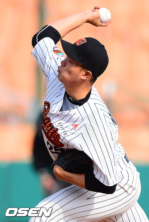 9회초 마운드에 오른 롯데 강승현이 힘차게 공을 뿌리고 있다.