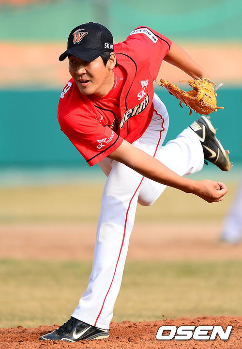 9회말 마운드에 오른 SK 윤길현이 힘차게 공을 뿌리고 있다.