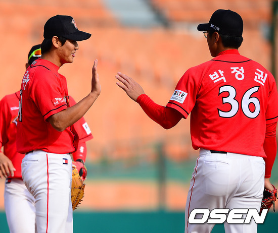 경기를 마치고 SK 마무리 윤길현과 박정권이 마운드 근처에 모여 하이파이브를 하고 있다. / rumi@osen.co.kr