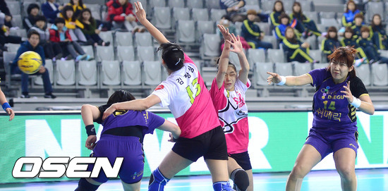 8일 오후 서울 방이동 SK핸드볼경기장에서 열린 '2013 SK 핸드볼 코리아리그' 여자부 SK 슈가글라이더즈와 컬러풀대구의 경기 전반 대구 김진이가 공격을 시도하고 있다.