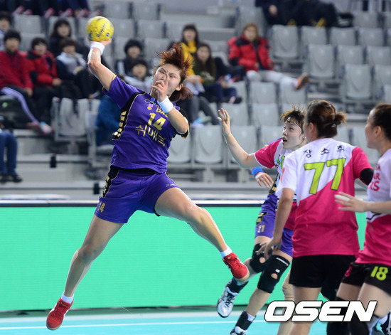 8일 오후 서울 방이동 SK핸드볼경기장에서 열린 '2013 SK 핸드볼 코리아리그' 여자부 SK 슈가글라이더즈와 컬러풀대구의 경기 전반 대구 김진이가 슛을 시도하고 있다.