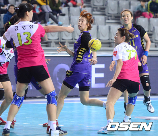 8일 오후 서울 방이동 SK핸드볼경기장에서 열린 '2013 SK 핸드볼 코리아리그' 여자부 SK 슈가글라이더즈와 컬러풀대구의 경기 전반 대구 김수정이 패스미스를 범하고 있다.