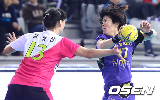 8일 오후 서울 방이동 SK핸드볼경기장에서 열린 '2013 SK 핸드볼 코리아리그' 여자부 SK 슈가글라이더즈와 컬러풀대구의 경기 전반 대구 안정화가 패스를 하고 있다.
