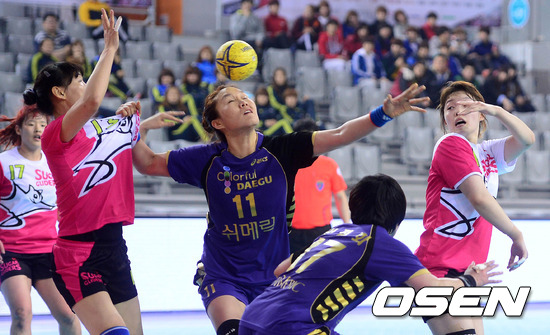 8일 오후 서울 방이동 SK핸드볼경기장에서 열린 '2013 SK 핸드볼 코리아리그' 여자부 SK 슈가글라이더즈와 컬러풀대구의 경기 후반 권근혜가 김정심에게 패스를 하고 있다.