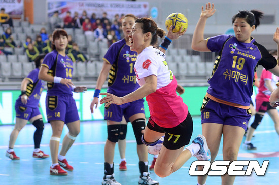 8일 오후 서울 방이동 SK핸드볼경기장에서 열린 '2013 SK 핸드볼 코리아리그' 여자부 SK 슈가글라이더즈와 컬러풀대구의 경기 후반 SK 장소희가 슛을 시도하고 있다.