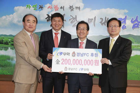 홍준표 경남 FC 구단주가 8일 오후 (주)무학으로부터 후원금 2억 원을 전달받았다.