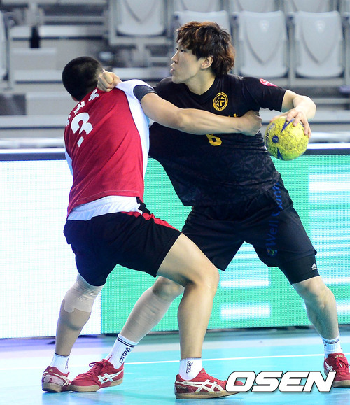 8일 오후 서울 방이동 SK핸드볼경기장에서 열린 '2013 SK 핸드볼 코리아리그' 남자부 상무피닉스와 인천도시공사의 경기 전반 이건웅(왼쪽)과 유동근이 볼다툼을 하고 있다.