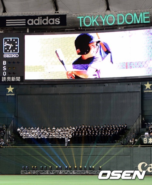 8일 오후 일본 도쿄돔에서 2013 월드베이스볼클래식(WBC) 2라운드 1조 일본과 대만의 경기, 경기에 앞서 외야에서 합창 단원들이 노래를 부르고 있다.