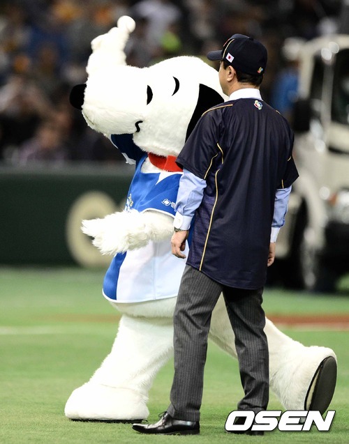 8일 오후 일본 도쿄돔에서 2013 월드베이스볼클래식(WBC) 2라운드 1조 일본과 대만의 경기, 경기에 앞서 애니메이션 캐릭터 스누피가 시구를 하고 있다.