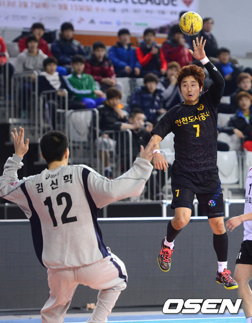 8일 오후 서울 방이동 SK핸드볼경기장에서 열린 '2013 SK 핸드볼 코리아리그' 남자부 상무피닉스와 인천도시공사의 경기 전반 조현철이 슛을 시도하고 있다.