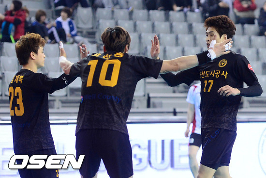 8일 오후 서울 방이동 SK핸드볼경기장에서 열린 '2013 SK 핸드볼 코리아리그' 남자부 상무피닉스와 인천도시공사의 경기 후반 인천 선수들이 역전 후 기뻐하고 있다.